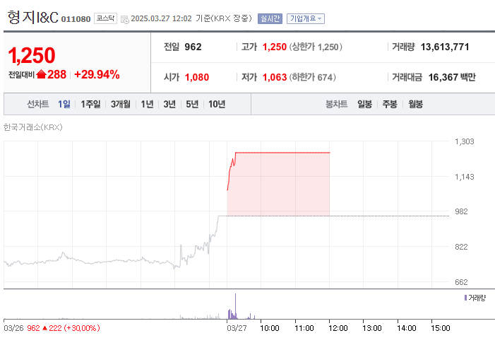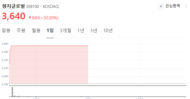 가장 주목할 만한 종목은 형지글로벌입니다. 3월 27일 오전 11시 30분 기준, 코스닥 시장에서 형지글로벌의 주가는 전일 대비 무려 30% 상승해 상한가에 도달하며 3,640원에 거래되고 있습니다. 형지글로벌은 최근 기업명을 까스텔바작에서 변경한 바 있으며, 이와 동시에 이재명 관련주로 거론되며 투자자들의 관심이 집중되었습니다.