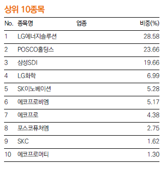 그렇다면 실제 구성 종목을 살펴볼까요? 가장 높은 비중을 차지하는 기업은 LG에너지솔루션으로, 국내 배터리 산업의 선두주자입니다. 이어서 POSCO홀딩스와 삼성SDI, LG화학, SK이노베이션 등의 대기업이 이름을 올리고 있습니다. 여기에 에코프로, 에코프로비엠, 포스코퓨처엠, SKC, 에코프로머티 등 2차전지 관련주로 급부상한 중소형 성장주들도 포함되어 있죠.