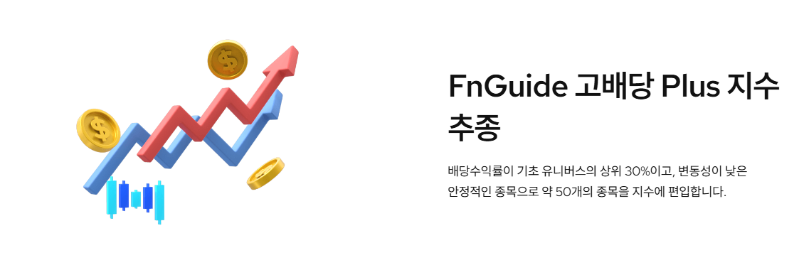 이 ETF는 FnGuide 고배당 Plus 지수를 추종하며, 해당 지수는 유가증권시장에 상장된 종목 중 전년도 배당수익률 상위 30%에 해당하고, 동시에 변동성이 낮은 종목들을 선별해 약 50개 종목으로 구성됩니다. 즉, 단순히 배당률만 높은 기업이 아닌, 실적과 주가 흐름이 비교적 안정적인 국내 배당주를 중심으로 포트폴리오가 짜여 있는 것입니다.