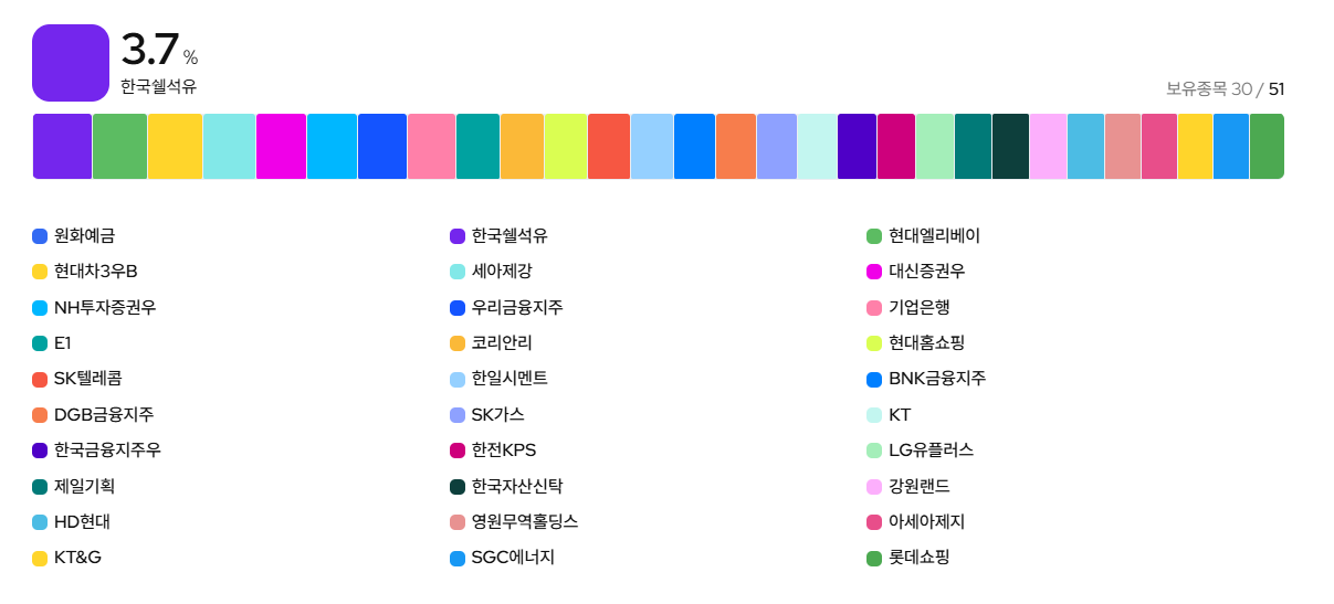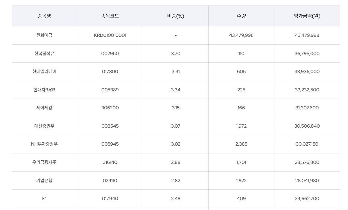 예를 들어, Kodex 고배당의 주요 편입 종목을 살펴보면 한국쉘석유, 현대엘리베이, 현대차3우B, 대신증권우, NH투자증권우, 우리금융지주, 기업은행, 세아제강, E1 등이 포함되어 있으며, 이들은 모두 배당주로서의 면모를 갖춘 동시에 시장에서 안정적인 수익성과 실적을 유지하고 있는 기업들입니다.