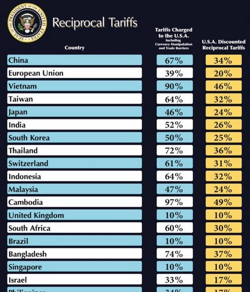 상호관세란 기존의 경제 용어는 아니며, 트럼프 정부가 새롭게 도입한 개념입니다. 쉽게 말해, 특정 국가가 미국 제품에 대해 부과하고 있는 관세율만큼 동일하게 미국도 그 나라 제품에 동일한 수준의 관세를 부과하겠다는 원칙입니다. 예를 들어, 한국이 미국산 제품에 평균 50%의 무역 장벽을 갖고 있다고 판단되면, 미국도 한국 제품에 대해 25%~50% 수준의 상호관세를 메기겠다는 것입니다.