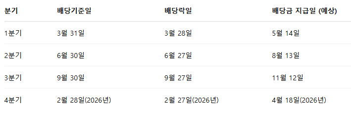 배당금 지급일은 예년과 유사하게 5월 중순으로 예상되며, 실제 2024년에는 5월 14일에 지급된 바 있습니다. 따라서 올해도 비슷한 일정이 유력합니다.