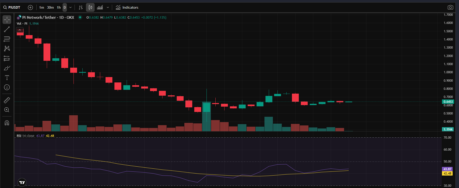 현재 파이코인의 가격은 약 0.64달러 수준이며, 24시간 기준 거래량은 약 1억 달러로 전일 대비 32%가 감소한 상태다. 그러나 전체 거래소 유통량이 줄고 있는 점, 기술적 반등 시그널, 그리고 실사용 확대 기대감이 복합적으로 작용하면서 투자 심리는 점차 긍정적으로 이동 중이다.