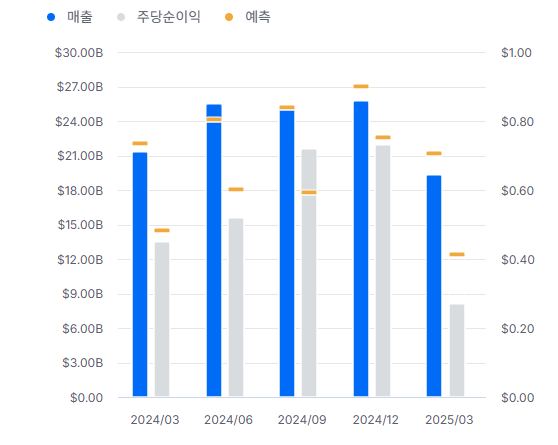 테슬라는 2025년 1분기 매출이 193억 4000만 달러로, 시장 기대치인 214억 3000만 달러에 크게 못 미쳤다. 전년 동기 대비 역시 감소세를 보였고, 주당 순이익도 0.27달러로 예상치(0.44달러)에 한참 미달했다. 이로 인해 테슬라의 전통적인 성장 가이던스도 철회되며, 향후 2분기에 다시 조정될 예정이다.
