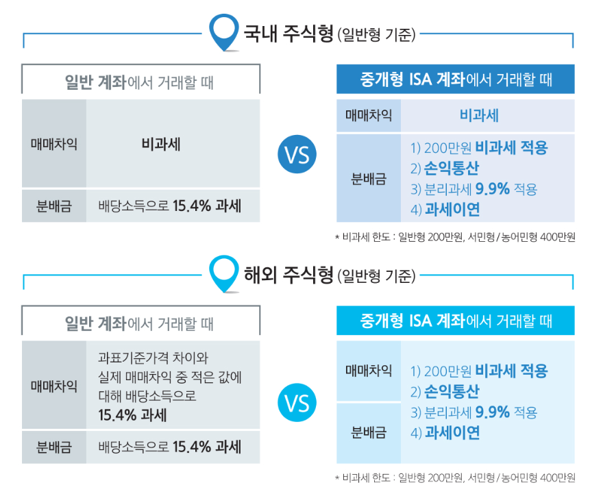 ISA 계좌의 가장 큰 장점은 세금 부담을 줄일 수 있다는 점입니다. 일반적인 계좌에서는 금융소득에 15.4%의 세금이 부과되지만, ISA 계좌에서는 일정 금액까지 비과세 혜택을 누릴 수 있습니다. 예를 들어, 일반형 ISA 계좌는 순이익 200만 원까지 비과세가 적용되며, 서민형 및 농어민형 계좌는 이 한도가 400만 원까지 늘어납니다. 또한 초과한 금액에 대해서는 9.9%의 분리과세가 적용되어 세금 혜택이 매우 유리합니다.