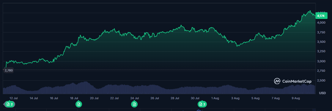2025년 8월 기준, 이더리움 가격은 한 달 전 대비 50% 이상 상승했습니다. 2,700달러 선에서 횡보하던 가격이 4,100달러를 넘어섰고, 일부 거래소에서는 4,200달러에 근접했습니다. 특히 최근 7일간 하루 평균 5% 안팎의 상승률을 기록하며, 거래량도 지난 3개월 평균 대비 2배 이상 증가했습니다. 이 같은 시세 움직임은 단기 투자자뿐만 아니라 장기 보유자들의 관심과 매수세를 동시에 끌어올리고 있습니다.